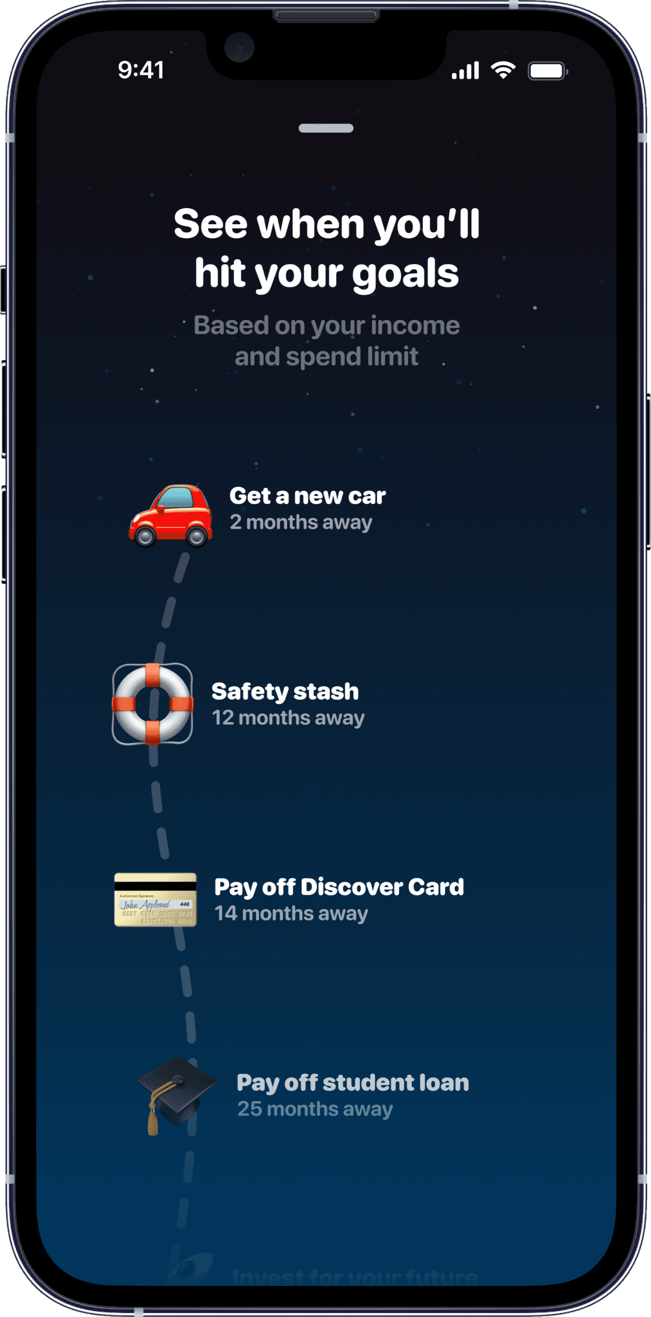 Milo's financial plan shows you how to reach goals and when, whether it's paying off debt, saving up, or whatever matters most to you.